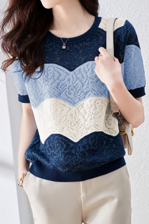 Farbblock-Hohlstrickshirt mit kurzen Ärmeln